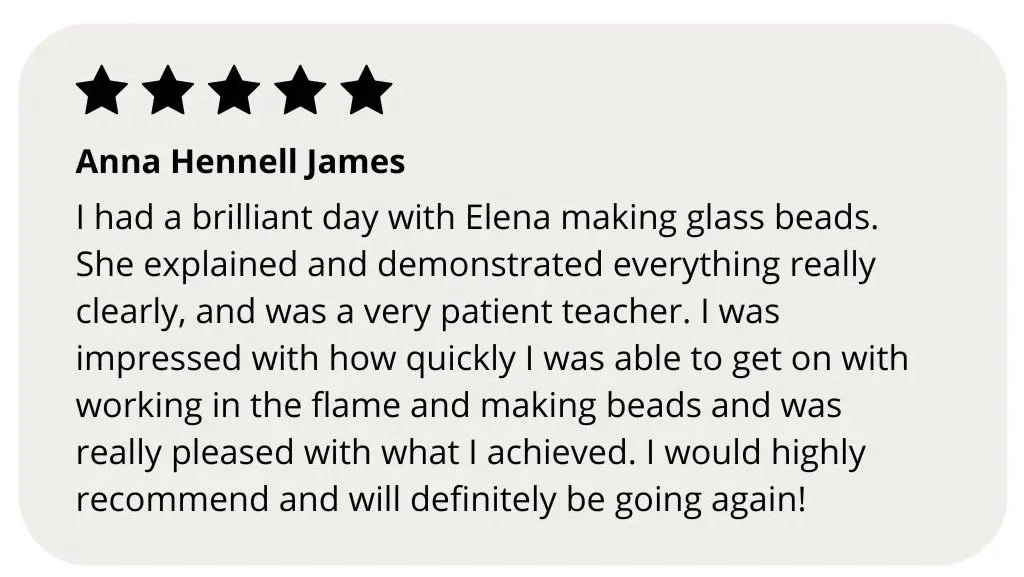 Gift vouchers are available for all workshops and make a thoughtful present for birthdays, special occasions or creative experiences. Vouchers can be used towards Glass Bead Making or Sculptural Borosilicate workshops and are valid for both half-day and full-day courses.